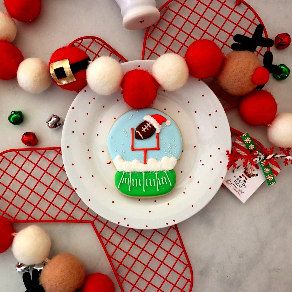 Celebrate the season with this whimsical Christmas Football Snow Globe sugar cookie—a hand-decorated masterpiece featuring a Santa-hatted football soaring over a goal post, all nestled within a charming snow globe design. Crafted with premium ingredients and meticulous detail work, this festive treat captures the playful intersection of holiday cheer and football fandom. Perfect for sports enthusiasts, holiday gift boxes, or as a standout centerpiece for seasonal gatherings.