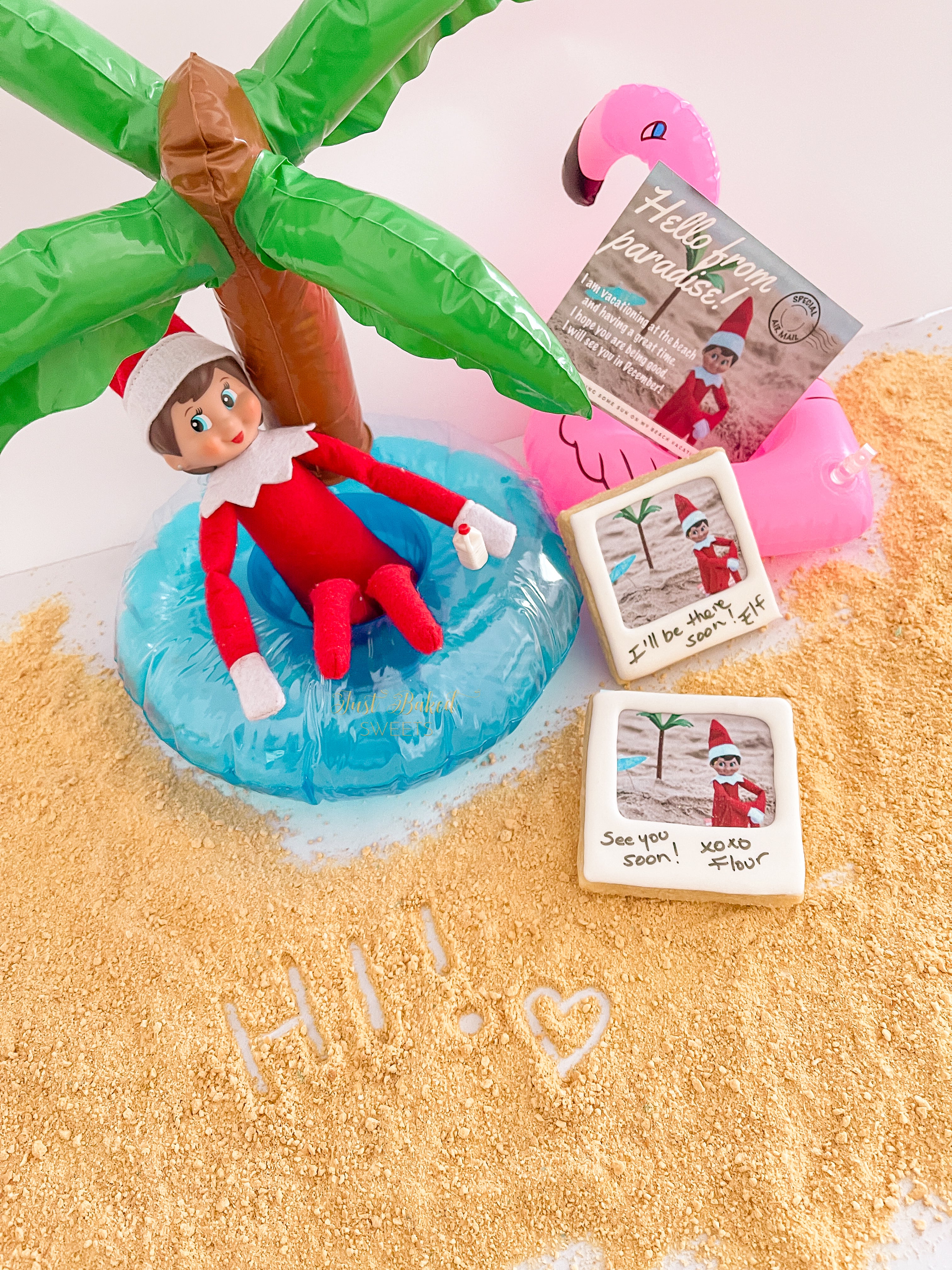 • Hand-decorated Polaroid-style sugar cookie showing your elf relaxing at the beach